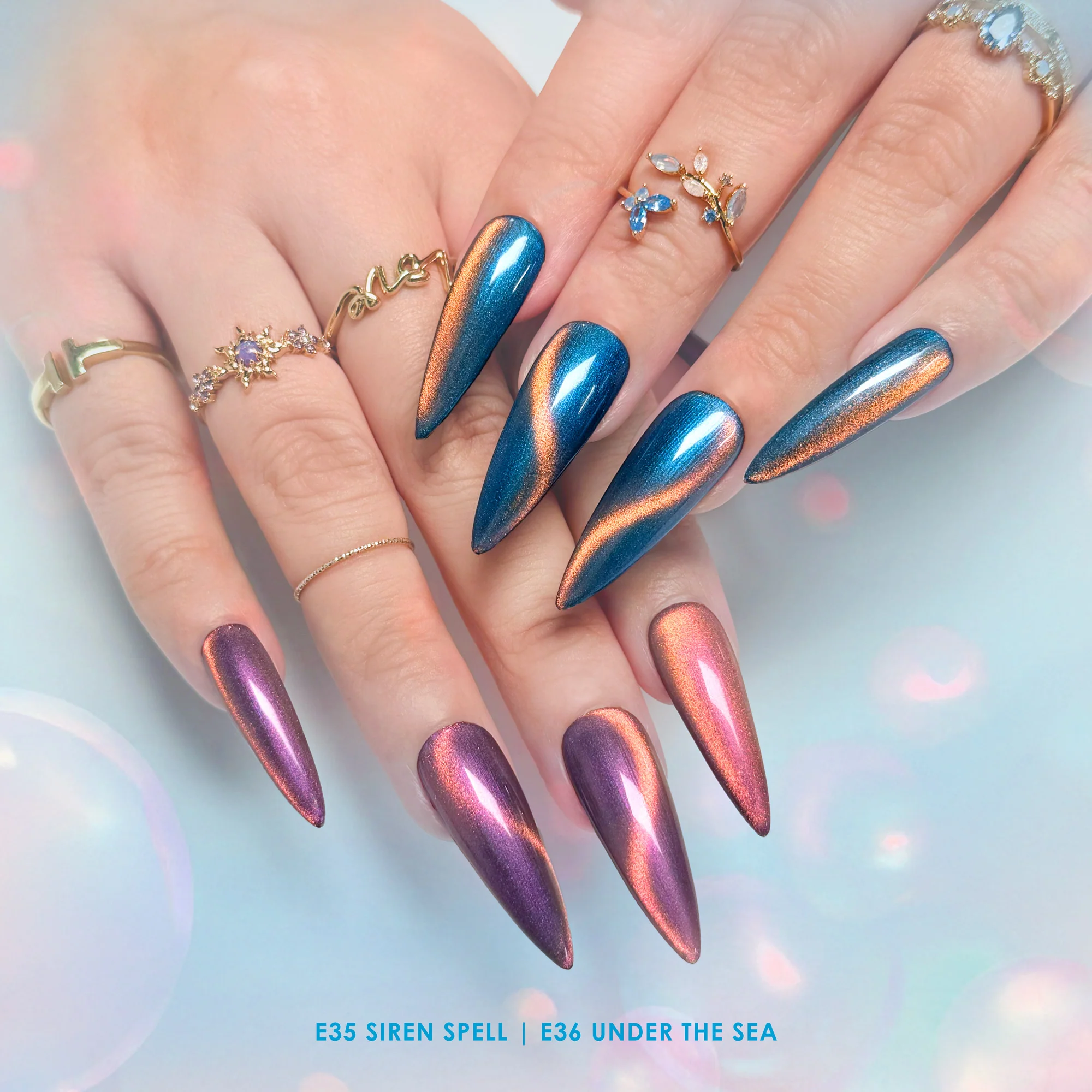 The Mermaid Chameleon Cat Eye Collection features six hypnotic cat eye gels that capture the magic of the sea, each shade shifting like treasures hidden beneath the waves. These gels showcase multi-tonal color shifts that dance beautifully at different angles, creating a multidimensional effect that brings your nails to life. Let your nails shimmer with ocean tides, twilight glimmers, and mermaid dreams. Perfect for mermaidcore moods, beachy daydreams, and adding that splash of underwater fantasy to your mani because every set deserves a touch of sea magic.