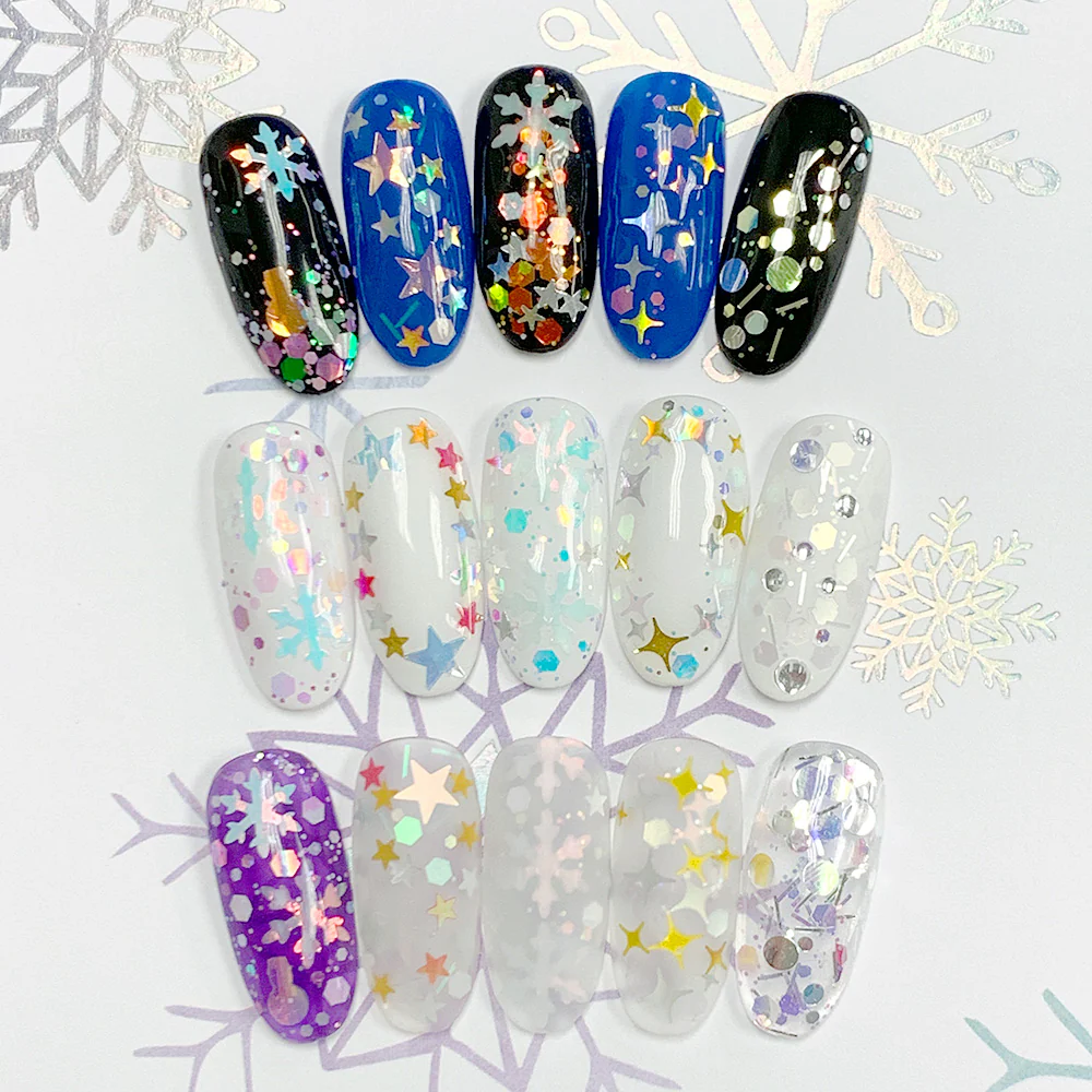 A dreamy mix of Winter Wonderland inspired white AB, iridescent and snowflake glitters. Perfect for holiday and winter season nail art! Can be used with nail polish, gel or acrylic.